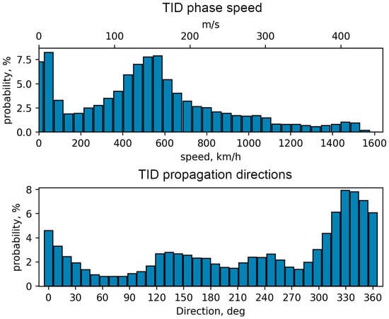Figure 4 shows the distribution of the detected ionospheric disturbances by TID phase speed (upper panel) and TID propagation directions (lower panel). The averaged values for all 41 days are shown, averaged for all coordinate points with a step of 1 degree. As can be seen from the figure, most of the detected TIDs have a phase velocity of about 150 m/s, which is close to values derived in [34,35]. It is worth noting that this velocity changes little during the year, but has a significant variation of more than 50% during each day.