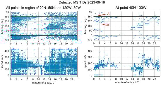 Directions (azimuth from north) and speeds of detected TID, 16 September 2023, at all points of map (left pane) and at point 40° N 100° W (right pane). The wave groups moving in northern and western directions labeled A and B respectively.