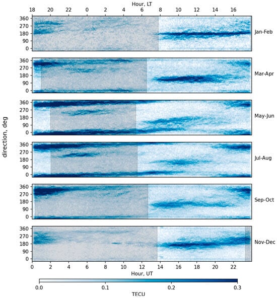 As can be seen from the figure, three areas of TIDs are clearly distinguished: a «daytime» and two «nighttime». We would like to note that by highlighting these three areas, we are not classifying TIDs; all of them can be classified as medium-scale TIDs. We are only pointing out that they can be clearly identified by their characteristics—time of occurrence and travel direction. Daytime TIDs that occur immediately after sunrise are observed throughout the year, but in the summer months their intensity and duration are 2–3 times less than in the winter months. Nighttime TIDs propagate mainly in the southern direction in the winter months and in the south-southeast in the summer months. Nighttime TIDs are also observed throughout the year, but in the winter months their intensity is low. In the summer months, nighttime TIDs occur several hours before sunset and continue until sunrise, propagating in the northwest–west direction. It is worth paying special attention to the fairly stable behavior of nighttime TIDs observed from April to August in the period from 21 to 02 h LT and propagating in the southwest direction. Their intensity is low compared to the main mode of nighttime disturbances, but they are clearly detected by this method. The occurrence of time of night medium-scale TIDs are in good agreement with results obtained in [36], and the time of appearance and types of TIDs are consistent with [37].