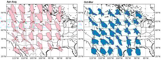 Figure 6 shows the distribution of TID amplitudes depending on the propagation direction (azimuth from north) and time of day. The distribution for different seasons of 2023 is given. The distribution is calculated for all points in the rectangle of coordinates 35° N–45° N by 110° W–90° W, as having a high density of GNSS receivers.
