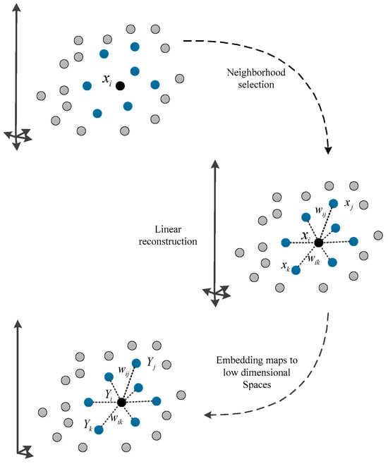 LLE is a classical algorithm of manifold learning. It regards the linear reconstruction representation relationship between sample points and their local neighbors as the characterization of local geometric properties of manifolds. Its fundamental concept is to start with the local linearity of nonlinear data, based on which the global nonlinearity of the dataset is transformed into local linearity. According to the global structure information provided by the overlapping local neighborhoods, the global optimal low-dimensional embedding representation is sought while the local geometric relation of the data is fully preserved. The local linear embedding algorithm can learn the local structure of any dimension and is widely used in many applications such as fault detection and image recognition. Consequently, the application and improvement of the local linear embedding algorithm have been widely researched [6]. The LLE algorithm, as shown in Figure 1, includes the following three steps:
