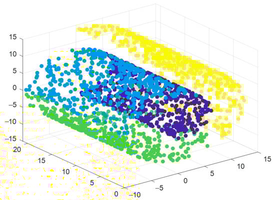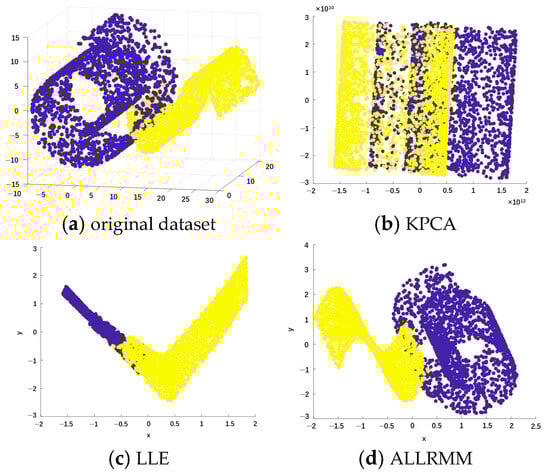 Figure 7 shows the mixed manifold structure dataset and the effects after being processed by different dimensionality reduction methods. The original dataset needs to be better presented in a three-dimensional space to show the separation and distribution of the data. Two-dimensional graphs are used to display the results after dimensionality reduction, as most dimensionality reduction methods aim to map high-dimensional data to a two-dimensional space for visualization and analysis. Through these graphs, the effects of different dimensionality reduction methods in handling the mixed manifold structure dataset can be intuitively compared, especially their ability to distinguish different manifolds or categories. Figure 7a presents the original dataset of the mixed manifold structure; different colors in the dataset represent different manifolds. The X-axis, Y-axis, and Z-axis, respectively, represent the three original features of the data, which are the natural attributes of the data generation process and are used to describe the position of the samples in the three-dimensional space. This figure is used to show the distribution of the data before any dimensionality reduction processing. The following three subfigures, respectively, show the results after using KPCA, LLE, and the ALLRMM method proposed in this paper. The coordinate axes represent the two main components after dimensionality reduction. The figure shows the distribution of the data points after dimensionality reduction, and different colors represent different manifolds.