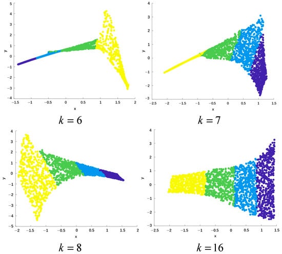 Figure 3 further explores the sensitivity of the Local Linear Embedding (LLE) algorithm to the neighborhood parameter . LLE is a popular manifold learning method that aims to achieve low-dimensional embedding of high-dimensional data by preserving the local geometric relationships between data points. Figure 3 shows the results of the LLE algorithm reducing the Swiss Roll dataset from three dimensions to two dimensions under different values. Each subgraph corresponds to a specific value, and the X-axis and Y-axis represent the coordinates in the two-dimensional space. By checking the dimensionality reduction results under different values, one can observe the significant impact of the value selection on the performance of the LLE algorithm. If is too small, the linearity of the nearest neighbor region is guaranteed, but the global property of the data cannot be reflected. If is too large, the premise that the algorithm can learn local linearity of the manifold does not hold. Therefore, it can be seen that the selection of the nearest neighbor number significantly affects the dimensionality reduction effect of the LLE algorithm.