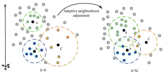 For places with low local density of sample points, a few neighborhood sample points are picked to make the neighborhood smaller and prevent too many local neighborhoods from destroying the local linearity hypothesis of manifold learning. In Figure 4, assuming that the initial fixed value is 6, it can be found that the local density of sample points a and b is large, while the sample density of point c is small. Selecting a fixed field parameter value of 6 will make the neighborhood of points a and b with high local density too small, and the manifold will be divided into multiple discontinuous subgraphs. The neighborhood of point c with small local density is too large, which destroys the assumption of local linearity. So after adaptive neighborhood iteration, the value changed from the original 6 to , the neighborhood number of points a and b is increased, and that of point c is reduced, so that different neighborhoods overlap on the premise of maintaining local linearity, and information is transmitted between neighborhoods.