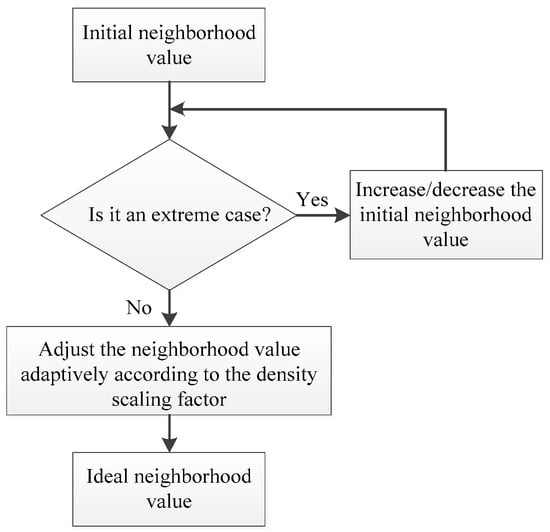 The adaptive neighborhood value iteration algorithm adapts the globally consistent initial neighborhood value to obtain the ideal neighborhood value of each sample point. According to the above calculation and adaptive iteration process based on the density scaling factor, the flow chart of the adaptive neighborhood iteration algorithm is shown in Figure 5.