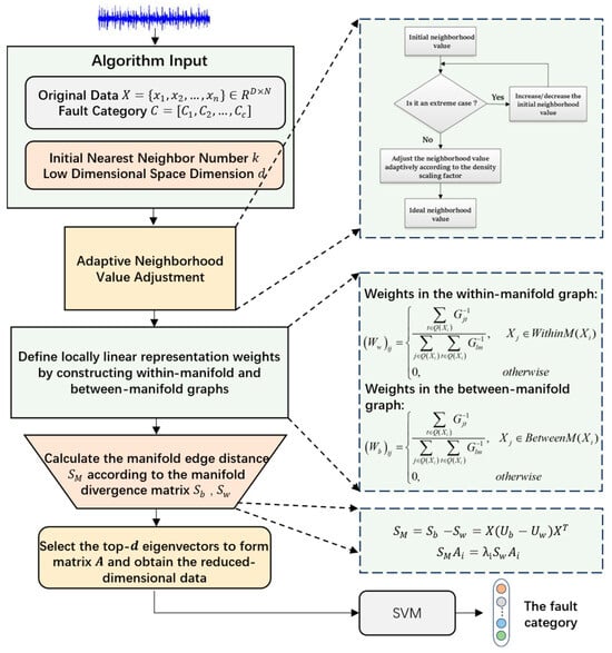 The conventional manifold learning method neglects the modeling of data within and between manifolds and fails to deal with the problem of multi-manifold recognition of high-dimensional data. Therefore, this paper proposes an improved Locally Linear Representation of Manifold Margins (LLRMM) [22,23] algorithm that constructs within-manifold and between-manifold graphs based on data labels, measuring the spacing of multi-manifolds on this basis. The algorithm achieves feature dimensionality reduction extraction for high-dimensional feature datasets by maximizing the spacing of manifolds and minimizing within-class differences. The core of the algorithm is built on LLE ALLRMM first fits the local linear model and then aligns the global coordinates. The global nonlinear manifold is divided into some small local linear sub-blocks, and then these sub-blocks are globally arranged together through information transfer to obtain a consistent low-dimensional manifold representation of the data. Compared to other algorithms, the proposed algorithm can adaptively divide into different sizes of sub-blocks, offering greater flexibility and adaptability while better accounting for the inhomogeneity of real data. As a result, it performs exceptionally well when handling rotating machinery fault datasets.