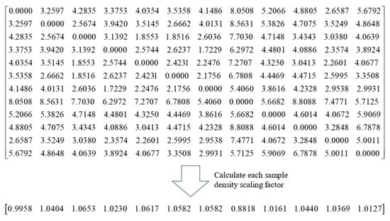 In Figure 8, it is the distance matrix of sample points and the density scaling factor calculated according to (3)–(6). Each element represents the Euclidean distance between sample points and .