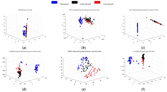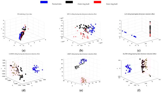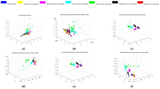 In order to prove the effectiveness of the method, the XJTU-SY bearing fault dataset was selected. Figure 9 shows the XJTU-SY dataset, and six types of fault data are selected for experiments. Blue represents normal data, red represents an early inner ring fault, and black represents a moderate inner ring fault. Green indicates a severe fault in the inner ring, yellow indicates an early fault in the outer ring, purple-red indicates a moderate fault in the outer ring, and light blue indicates a severe fault in the outer ring. It can be clearly seen from Figure 9 that the proposed ALLRMM algorithm distinguishes the fault data obviously and has less overlap. As shown in Figure 9a–c, for the T-SNE, KPCA, and LLE algorithms, the blue, red, and yellow patterns have obvious overlap, which makes it difficult to distinguish early faults. As shown in Figure 9e–f, the blue, red, and yellow patterns have less overlap, which is more obvious than that in Figure 9b–d, and Figure 9f is more obvious than that in Figure 9e in distinguishing moderate and severe faults.