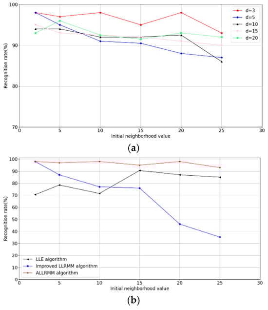 As shown in Figure 12a, when the initial neighborhood value changes from 2 to 25, the recognition rate is negatively correlated with the initial neighborhood value, showing a downward trend. That is, a larger initial neighborhood value results in a lower recognition rate, which further demonstrates that the LLRMM algorithm improved by multi-manifold learning is appropriately sensitive to the selection of the initial neighborhood value. When changes from 3 to 20, the recognition rate is positively correlated with dimension. The figure shows that the average recognition rate of the improved LLRMM algorithm peaks at 97.50%. To further compare the influence of different initial neighborhood values on the algorithm, the LLE, LLRMM, and ALLRMM algorithms were selected for comparison under the ideal feature dimension of different initial neighborhood values. For the comparison, the average neighborhood values of all sample points under different initial neighborhood values were calculated after applying the adaptive neighborhood value iteration algorithm.