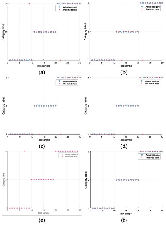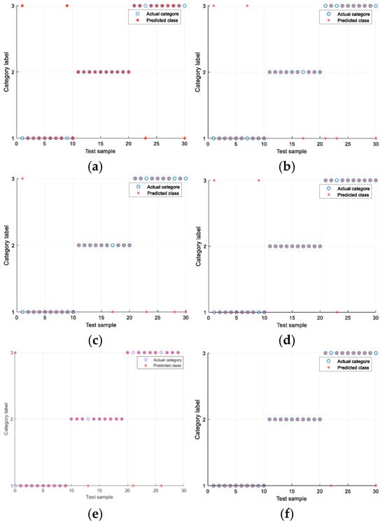 The experiments were conducted under the Ottawa Condition 1 and Condition 4 datasets. The experimental results are shown in Table 6 and Table 7, as well as Figure 13 and Figure 14. In the figures, the vertical axis represents the bearing health status, where Class 1 denotes the healthy condition, Class 2 indicates an inner race fault, and Class 3 corresponds to an outer race fault. The horizontal axis represents the test samples. As shown in Table 7, the fault diagnosis algorithm proposed based on multi-manifold learning ALLRMM has the same obvious effect under variable conditions. Under condition 1, the highest average recognition accuracy is 96.67%, and the highest recognition accuracy can reach 100%. As shown in Table 7, under working condition 4, the average recognition rate of the four algorithms is also the highest, which is 92.33%, and the highest recognition accuracy is 93.33%. Compared with KPCA and LLE, which are more sensitive to variable working condition data, the fault diagnosis accuracy is low. The algorithm based on ALLRMM proposed in this paper also has higher recognition accuracy under changing working conditions.