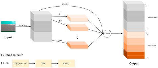 In Figure 2, the term “cheap operation” denotes lightweight computational operations designed to balance feature extraction effectiveness and computational efficiency. Specifically, within this architecture, it is instantiated as a sequence of DWConv with a 3 × 3 kernel, followed by BN and the ReLU activation function.