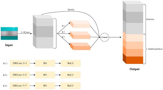 Traditional convolution generates feature maps through extensive computations, but studies have shown that many feature maps contain redundancy. GhostConv [22] is a lightweight convolutional architecture that splits feature generation into two parts: one part obtains high-quality features via standard convolution, while the other generates “Ghost features” through inexpensive operations. The structure diagram of GhostConv is shown in Figure 2. However, the original GhostConv employed a fixed linear transformation when generating redundant feature maps, which led to insufficient feature representation in the presence of complex background interference or minor defects, thereby affecting the final detection performance. To address this, we proposed an improved GhostConv module, named MultiScaleGhost.