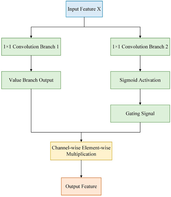 In the formula, denotes the input feature map; and represent 1 × 1 convolution operations, which generate the value branch and the gating branch, respectively; indicates element-wise multiplication, enabling channel-wise selective activation; and stands for the Sigmoid activation function.