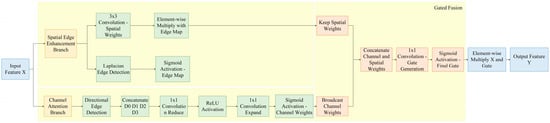 Subsequently, we employed a 3 × 3 convolution to perform local spatial modeling on the input features, generating the base spatial weight S. We then fused this weight with the edge probability map to obtain the enhanced spatial attention map S’, and its calculation formula is presented in Equation (5).