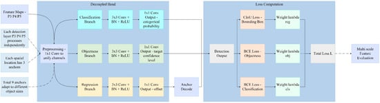 The detection head of YOLOv12 employs a typical anchor-based [31] design and structurally features a Decoupled Head [32]. Anchor-based object detection represents a prevalent detection paradigm, whose core mechanism involves presetting a set of anchor boxes with varied scales and aspect ratios across the feature map of an image. These anchors are then matched with ground-truth objects to regress both positional offsets and class probabilities. In terms of the loss function, YOLOv12 employed Complete-IoU (CIoU) Loss [33] for bounding box regression and Binary Cross-Entropy (BCE) Loss [34] for object confidence and multi-label classification; the overall loss was a weighted combination of these three components. The structure diagram of the YOLOv12 detection head is illustrated in Figure 7. This detection head structure boasted advantages such as fast inference speed and good convergence. However, it faces challenges in anchor box matching, a process involving the assignment of predefined anchor boxes to ground-truth objects based on overlap criteria, and exhibits inadequate accuracy when detecting small targets, densely packed defects, or surface flaws with complex morphologies.
