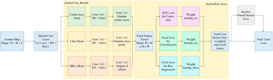 In the structural design, the anchor-free branch consisted of three parallel sub-modules: BBox Head, Class Head, and Centerness Head. The BBox Head outputted the distance offsets from each pixel to the target boundaries, the Class Head outputted the existence probability for each category, and the Centerness Head learned the geometric distance scores between pixels and the target center, which were used to suppress redundant predictions near the target edges. Ultimately, the total output shape of this branch was , where 4 corresponds to the four regression parameters of the bounding box (representing the distance offsets from the pixel to the left, right, top, and bottom boundaries of the target, respectively), 1 represented the centerness score, and C represented the number of categories.