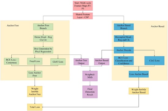 This strategy effectively integrated the high recall rate of the anchor-based branch with the precision advantage of the anchor-free branch in small object detection, removed redundant boxes, and retained high-quality prediction results. The flowchart of the Hybrid Head detector with anchor-based and anchor-free approaches is shown in Figure 9.
