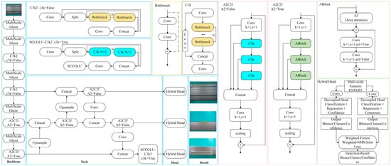 We proposed three improvements based on YOLOv12: first, we designed a lightweight convolutional module with multi-scale feature enhancement, named MultiScaleGhost, to replace the original Conv layer in the Backbone, thereby enhancing feature extraction capability and efficiency. Second, we proposed a Spatial-Channel Collaborative Gated Linear Unit, which achieved significant enhancement of fine-grained defect regions through the collaborative fusion of direction-aware channel attention and edge-guided spatial modeling. Using a post-enhancement strategy, we integrated this unit after the C3k2 module in the Neck section of YOLOv12. Third, we constructed a Hybrid Detection Head that integrates anchor-based and anchor-free detection methods, combining the advantages of both approaches to enhance localization accuracy and sample adaptability. The overall improved MCH-YOLOv12 network structure is illustrated in Figure 10.