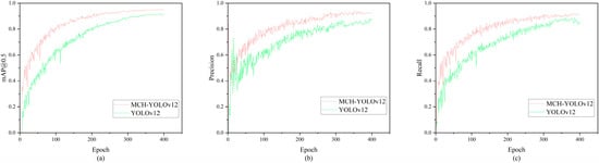 Visualization results of the comparative experiments. (a) The precision comparison chart of each model; (b) the recall comparison chart of each model; (c) the mAP@0.5 comparison chart of each model.