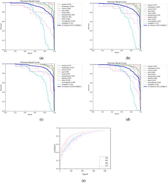 Visualization results of the ablation experiments. (a) The precision–recall curve of A0; (b) the precision–recall curve of A1; (c) the precision–recall curve of A2; (d) the precision–recall curve of A3; (e) the mAP@0.5 comparison chart of A4~A7.