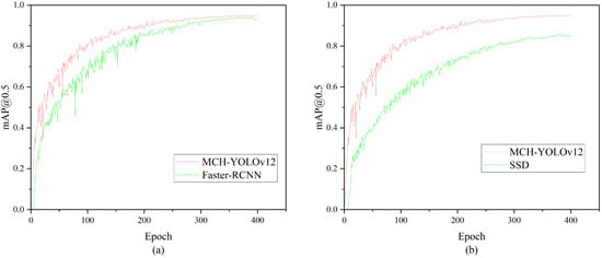Comparison chart of mAP@0.5. (a) The comparison results of mAP@0.5 between MCH-YOLOv12 and Faster-RCNN. (b) The comparison results of mAP@0.5 between MCH-YOLOv12 and SSD.