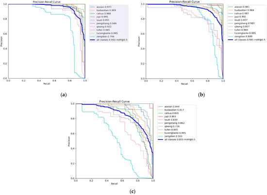 Visualization result diagram. (a) The precision–recall curve of MCH-YOLOv12. (b) The precision–recall curve of Faster-RCNN. (c) The precision–recall curve of SSD.