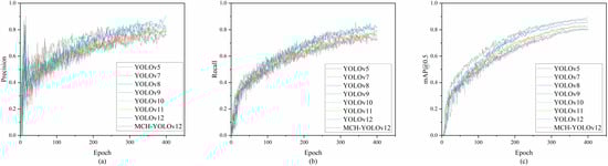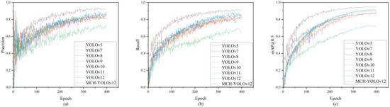 To comprehensively validate the overall performance of the proposed MCH-YOLOv12 model in the task of surface defect detection for aluminum profiles, we designed a large-scale comparative experiment. We selected mainstream versions of the YOLO series (YOLOv5, YOLOv7, YOLOv8, YOLOv9, YOLOv10, and YOLOv11), as well as Faster-RCNN [41] and Single Shot MultiBox Detector (SSD) [42] as reference objects, covering the typical development stages of object detectors in recent years. These models exhibited distinct characteristics in detection accuracy, speed, and model architecture, serving as backbone frameworks widely adopted in practical application scenarios such as industrial inspection and unmanned inspection. By conducting comparisons under a unified experimental setup, we could more intuitively evaluate the applicability and advantages of the proposed method in practical tasks.