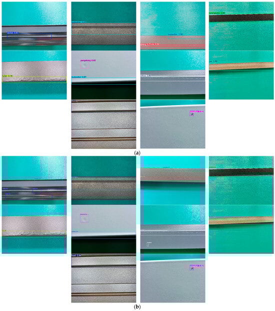 Performance of 10 types of surface defects on aluminum profiles in YOLOv12 and MCH-YOLOv12. (a) Detection results of the 10 defects in YOLOv12. (b) Detection results of the 10 defects in MCH-YOLOv12.