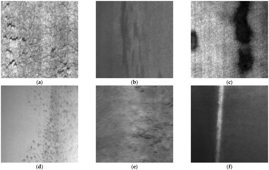 The six types of defects in the NEU-DET dataset. (a) An image containing the defect known as crazing. (b) An image containing the defect known as inclusion. (c) An image containing the defect known as patches. (d) An image containing the defect known as pitted surface. (e) An image containing the defect known as rolled-in scale. (f) An image containing the defect known as scratches.