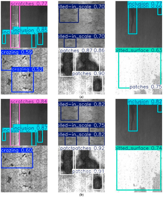 Performance of YOLOv12 and MCH-YOLOv12 on 6 types of surface defects in the NEU-DET dataset. (a) Detection results of the 6 defects in YOLOv12. (b) Detection results of the 6 defects in MCH-YOLOv12.