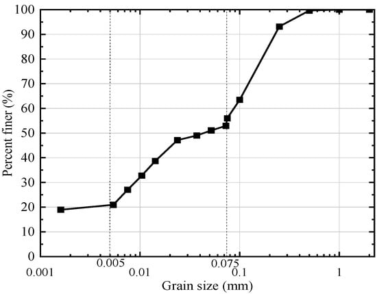 The soil used in this study was sampled from Taizhou City, Zhejiang Province, China. The properties of the tested soil are listed in Table 1, and its grain size distribution is shown in Figure 1. The maximum dry density and optimum moisture content were determined via the standard Proctor compaction test. The organic matter content was measured using a muffle furnace. According to the Unified Soil Classification System (USCS), the tested soil is classified as low plasticity clay (CL).