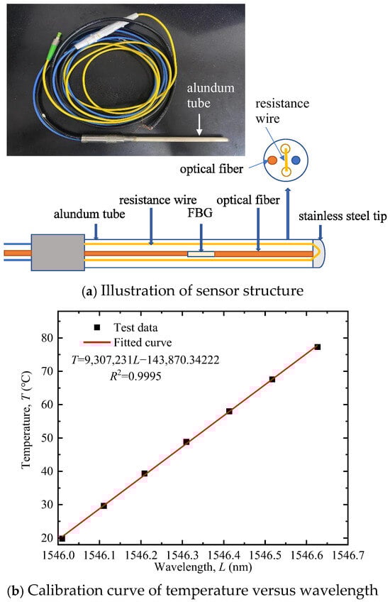The sensor and demodulator used in this study were manufactured by Suzhou NanZee Sensing Technology Co., Ltd., based in Suzhou, China. The basic structure of the FBG-based alundum tube-packed sensor, illustrated in Figure 2a, comprises a four-hole alundum tube (outer diameter 4.5 mm), a resistance wire, and a FBG. The alundum tube, with high rigidity, strength, excellent insulation, high-temperature resistance, and good thermal conductivity, protects the FBG from shear damage. The FBG fiber is placed in one small hole with one end stress-relaxed to eliminate strain interference on measurement results. The resistance wire runs through two holes in a U-shape and can be electrically heated via a power source. This FBG sensor operates within a temperature range of −40 °C to 80 °C with a measurement accuracy of 1‰ F.S. The wavelength–temperature correlation of the sensor was calibrated before factory shipment (Figure 2b). The calibration curve exhibits a strong linear relationship with a fitting degree of 0.9995, enabling direct conversion of wavelength to temperature with high accuracy.