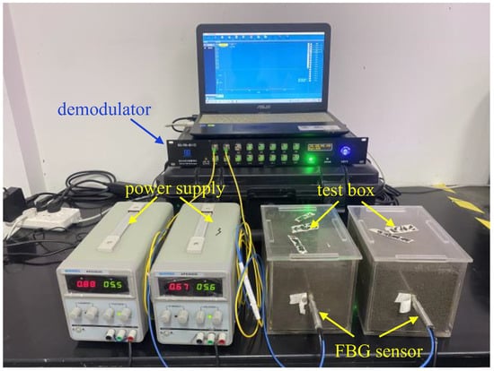 The measurement system is shown in Figure 3. This system comprises four components: a DC regulated power supply for heating, a test box (20 cm × 15 cm × 15 cm) integrated with a FBG fiber sensor, a FBG fiber demodulator (with technical parameters listed in Table 2), and a computer for data processing. The test box size was verified by placing a FBG sensor at its horizontal edge while the central FBG sensor operated. No wavelength change was observed in the edge sensor throughout the test, confirming the box is sufficiently large to meet the line heat source model assumption.