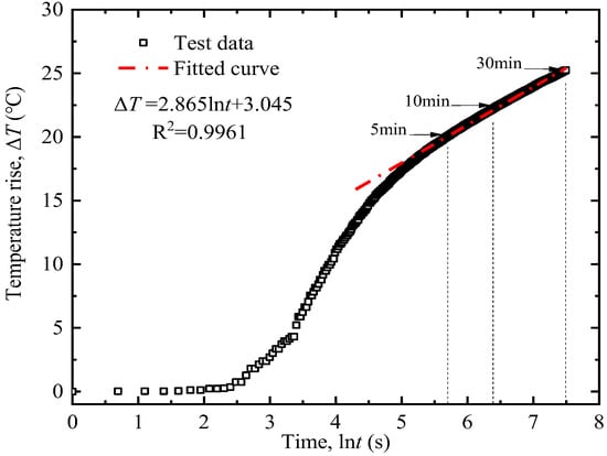 - Measurement by the AHFO-FBG method: Activate the demodulator. Measure the room temperature using the FBG sensor and verify it with a thermometer. After confirming the optical fiber is intact, connect the power supply to start heating at a constant power of 20 W/m for 10 min. Wavelength variations during the heating process are converted to temperature rises using the calibration curve in Figure 2b, and the temperature rise-ln (time) curve is plotted to determine its slope k. A typical result is shown in Figure 4. Soil thermal conductivity is then calculated via Equation (6). Each test was repeated three times, and the average value was adopted to reduce random errors.