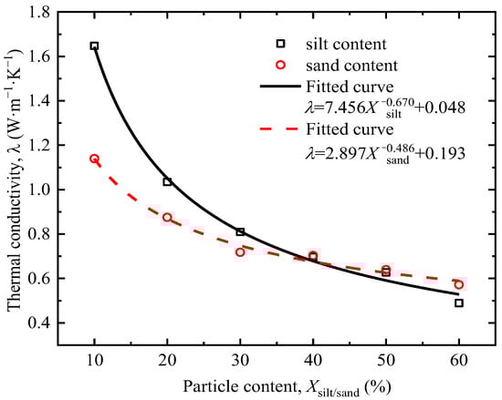 Figure 5 shows the thermal conductivity of tested clay at different silt and sand contents. With the increase in sand or silt content, the thermal conductivity of the soil continuously decreases. This is mainly because when the water content of the tested soil is 20%, the increase in sand or silt content leads to an increase in soil porosity, which increases the volume of air. Since the thermal conductivity of gas is lower than that of solids, this results in a decrease in the overall thermal conductivity of the soil. Overall, the thermal conductivity of soil is more influenced by silt content than sand content, primarily because silt, due to its fine particles, close contact, and strong adaptability to water content, generally has higher thermal conductivity than sand.