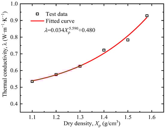 Figure 6 shows the thermal conductivity of tested clay at different dry densities. The thermal conductivity of soil increases with the increase in dry density. The increase in compactness leads to a decrease in the void ratio, a reduction in pore volume (especially large pores), and a relative increase in the proportion of water in the pores. Since the thermal conductivity of most soil minerals is basically above 2.0 W·m−1·K−1, the thermal conductivity of water ranges from 0.45 to 0.6 W·m−1·K−1, and the thermal conductivity of air is about 0.024 W·m−1·K−1 [35]. Therefore, soil with higher compactness has a higher degree of saturation and a greater thermal conductivity.