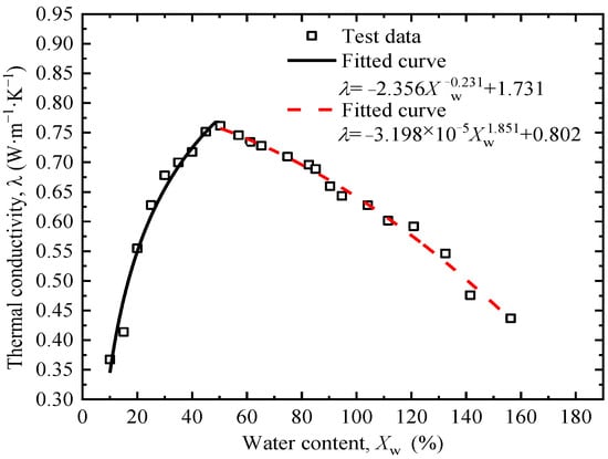 Figure 7 shows the thermal conductivity of the tested soil first increases and then decreases with the increase in moisture content. The critical moisture content for the trend change is about 50%, which is slightly higher than the liquid limit. When influencing factors such as dry density remain unchanged, soil particles, water, and air all participate in heat conduction when the water content is less than the critical moisture content. With the increase in water content, part of the water forms a water film wrapping soil particles, leading to an increasing number of water bridges between soil particles, which continuously expands the thermal conduction paths of the soil [36]. As the thermal conductivity of water is much higher than that of air, the increase in water content enhances the thermal conductivity of the soil. When the pores of the soil are filled with water, the thermal resistance coefficient of the soil is minimized, and the thermal conductivity is maximized. When the water content exceeds the critical moisture content, heat conduction occurs only within and between the solid and liquid phases. The thermal conduction of the soil is mainly dominated by water, whose thermal conductivity is much lower than that of soil minerals. Then the increase in water content causes the overall thermal conductivity of the soil to gradually decrease.