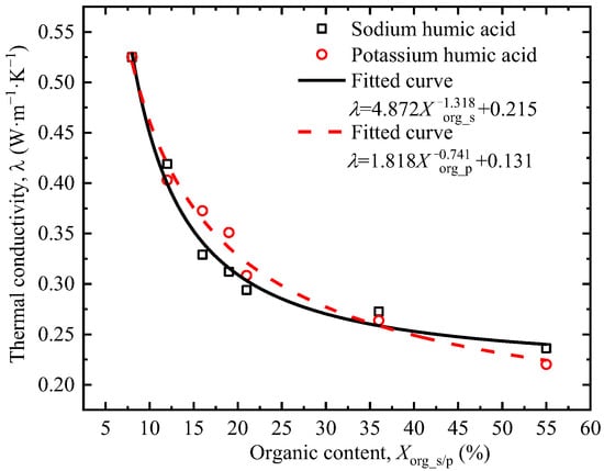 Humic acid accounts for about 50% to 80% of total organic matter in natural soils. The soluble salts of humic acid, potassium, and sodium humates were selected to mimic its native speciation in soil environments. Figure 8 shows that thermal conductivity decreases with the increase in organic matter content. When the organic matter content is low, the increase in organic matter content significantly reduces the thermal conductivity; when the organic matter content is high, the reduction in thermal conductivity is not obvious. Since the thermal conductivity of organic matter is between 0.1 and 0.4 W·m−1·K−1, which is much lower than that of soil minerals, organic matter fills the spaces between soil particles in a loose and porous form, replacing part of the mineral particles or forming isolation layers, thereby directly reducing the continuity of the thermal conductive matrix of the soil. The increase in potassium humate content reduces the thermal conductivity of soil slightly more than sodium humate. The reasons for this phenomenon need to be confirmed through further experiments.