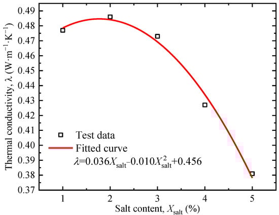 Figure 9 shows the soil thermal conductivity under different salt contents. The thermal conductivity of soil exhibits a two-stage characteristic with the increase in the salt content: when the salt content is lower than 2%, the thermal conductivity increases with the increase in salt content; when it exceeds 2%, the trend is reversed. The trend is consistent with the results of Lyu et al. [37]. The increase in the early stage is due to the increase in Na+ and Cl− ion concentrations in the NaCl solution. The negative charge of soil particles adsorbs Na+, leading to double-layer compression, the reduction of repulsive force range between particles, and thinning of the public hydration film, thus enhancing the thermal conductivity. The decrease in the later stage is due to two aspects: first, the thermal conductivity of the NaCl solution decreases with the increase in concentration, which leads to the decrease in soil thermal conductivity when the water content remains unchanged; second, the interaction between clay particles and salt ions produces flocculation and aggregation [37,38]. The flocculent aggregates are separated by free water, which greatly reduces the effective contact area between soil particles, and the higher the degree of flocculation, the lower the thermal conductivity.