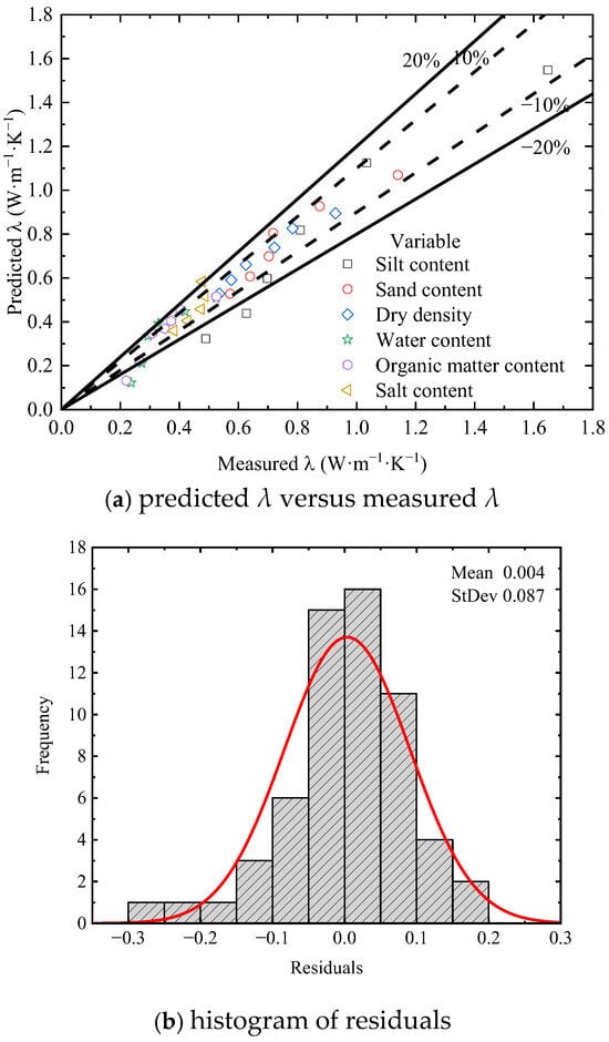 To assess the performance of the proposed modified model, an error analysis was conducted as shown in Figure 10. Figure 10a presents a scatter plot comparing measured λ and predicted λ by the modified model. Most data points cluster near the 1:1 line, suggesting that the modified model performs reasonably well. Few data points, mostly from the silt content, are outside the ±20% error bands. Figure 10b displays the histogram of residuals, i.e., the differences between measured and predicted λ values. The residuals are predominantly distributed within a narrow range around zero, showing an approximate symmetric pattern. This indicates that the model errors are random and unbiased, without systematic overestimation or underestimation. By calculating the root mean squared error (RMSE) and coefficient of determination (R2), the proposed modified model decreases the RMSE from 0.295 to 0.087 and increases the R2 from −0.55 to 0.866, thereby significantly enhancing the predictive performance of the model.