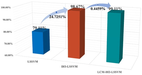 - The maximum accuracy achieved by the original LSSVM is 86.67 % (at ratio 2), while the HO-LSSVM improves this to 94.0%, and the LCM-HO-LSSVM reaches an impressive 98.0%. The improvements in accuracy are 8.4574% for the HO-LSSVM, 4.2553% for the LCM-HO-LSSVM, and a significant 13.0726% for the LCM-HO-LSSVM compared to the original LSSVM accuracy, as depicted in Figure 20.
