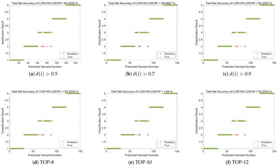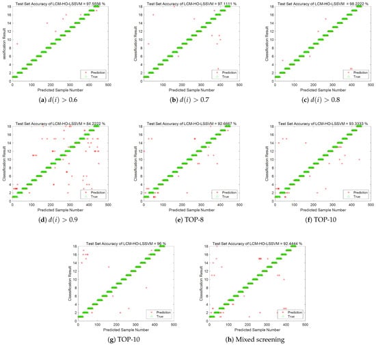 (3) The feature datasets obtained from the above screening method and without screening were imported into the LCM-HO-LSSVM-optimized classifier, using a training mode with a ratio of 2. The fault classification accuracy is shown in Figure 24 and summarized in Table 20: