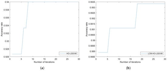 Convergence curves of HO-LSSVM and LCM-HO-LSSVM after 30 iteration. (a) HOLSSVM iteration curve; (b) LCM-HO-LSSVM iteration curve.