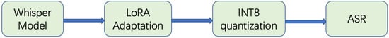 In this study, we integrate Whisper, LoRA, and INT8 quantization to construct an efficient Cantonese ASR system. The overall architecture of the proposed model is illustrated in Figure 1.