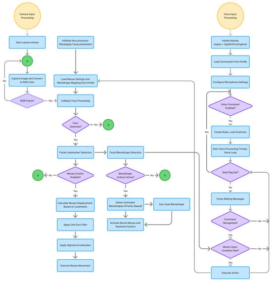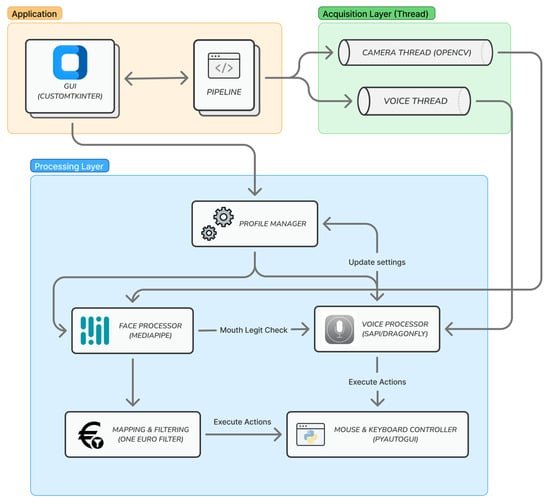 Figure 1 illustrates the overall system architecture and its integrated modules. Within the camera thread, OpenCV is adopted as the standard library for capturing and processing input images. Implemented in optimized C/C++ with multi-core support, it delivers high performance and a comprehensive set of tools for efficient real-time image processing [27]. Additional libraries are incorporated for specific modules, which will be described in detail in the following sections. The cross-modal coordination mechanism enhances interaction among modules: the face processor validates input for the voice processor, while the voice processor can adjust profile settings and influence the behavior of the face processor. Both modules interface with the operating system through PyAutoGUI, which enables seamless control of mouse and keyboard actions.