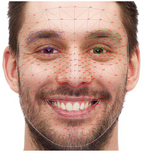 Based on the comparison results shown in the table above, we decided to use MediaPipe Face Landmarker as the core tool for developing our system. MediaPipe [31] provides 478 facial landmarks (Figure 3), including key regions such as the eyes, eyebrows, mouth, nose, and jawline, which are essential for precise facial expression analyses.