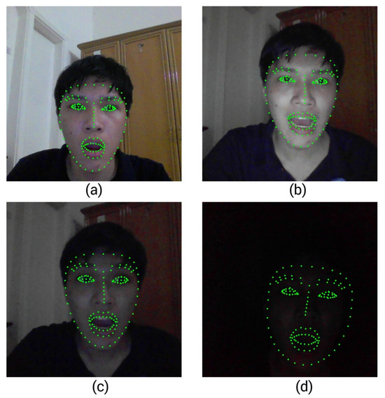 To assess the robustness of 3M-HCI under real-world usage, we conducted experiments in four different lighting environments, with corresponding results shown in Figure 8a–d. In each scenario, we visualized the 147 facial landmarks used by MediaPipe Face Mesh to detect expressions, enabling a detailed qualitative assessment of detection stability under varying illumination conditions. From our experiments, we can conclude the following: