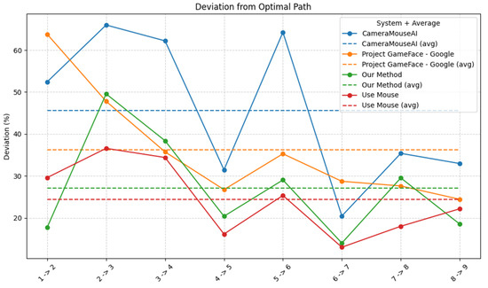 We measured the system’s accuracy by calculating the deviation of four systems (CameraMouseAI, Project GameFace (Googl)e, our method (3M-HCI), and normal mouse) from the optimal path (straight path) to the target, along with the number of clicks required to complete the task. The results are presented in Figure 9 and Figure 10 below.