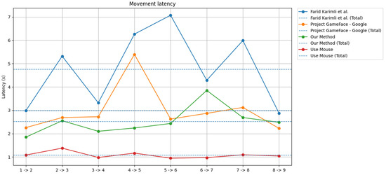 Moreover, the total average latency of our system (green dashed line) is clearly lower than that of CameraMouseAI (blue dashed line) and Project GameFace (orange dashed line), indicating faster and more consistent performance. While traditional mouse input (red line) remained the fastest as expected, our method showed a strong balance between speed and usability, especially considering its hands-free nature.