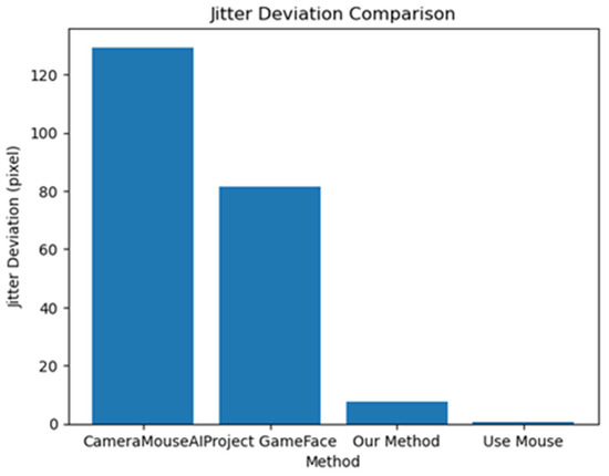 As illustrated in Figure 12, our method achieved significantly lower jitter deviation compared to other hands-free systems. Specifically, the CameraMouseAI showed the highest instability with a jitter deviation of over 120 pixels, followed by Project GameFace with approximately 80 pixels. In contrast, our method maintained a low deviation of under 10 pixels, indicating stable and precise cursor control. As expected, traditional mouse usage yielded the lowest jitter rate, serving as a performance baseline.